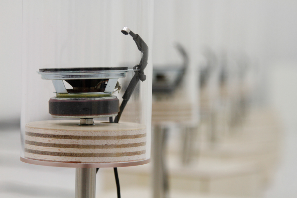 This installation uses the “howling” phenomenon known as microphone feedback.