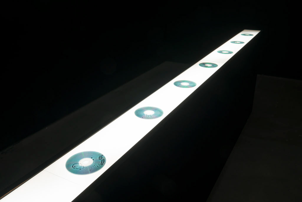 A sound installation transition [systemic] (2017) is dedicated to the conversion of natural mechanisms into artificial ones. It comprises a series of photograms that mimic a primitive life cycle. The photograms are the optical trails of primitive, life-like behaviour, such as division and fusion, generated through chemical reactions. The first image shows the birth of ‘chemical cells’, while the final one shows the collapse of the developed cells through evolution. The behaviours of the cells are transferred to the recording surface of optical media in photogram form. This piece explores the diversity of autonomous expression created through natural and artificial mechanisms.